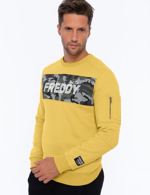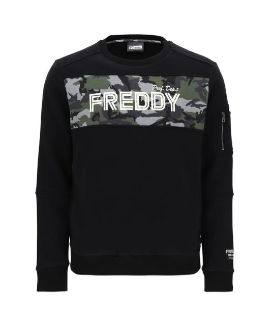 パネルステッチのクルーネックトレーナー。カモフラージュインサートとコントラストのあるFREDDYロゴが前面に施されています。柔らかなリブニット生地が袖口と裾をトリミングし、小さなジッパーポケットとアプライドロゴが袖にアクセントを添えています。レギュラーフィット。柔らかく、ビロードのような、起毛フリース生地の自然な柔軟性は、この快適なウエアを着る喜びに!ディテールから細部にわたり個性豊で、ダイナミックなトレーニングセッションやスポーツに最適なトレーナーです。快適さとスタイルに重点を置いたスポーティなカジュアルな服装としてもおすすめです。