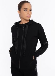 マキシドローストリング付きの調節可能なフードとスパンコールの袖にインサートとカラートーンのルレックス(ラメ)を備えたブラックジャケットジップパーカー。 ラウンドプーラー、袖口、レギュラーフィットのフルレングスのジップクロージャーが付いています。 伸縮性のある起毛フリース生地の柔らかなしなやかさから着心地が良く、スパンコールやルレックスの装飾が華やかな印象を与える魅力的なトータルブラックウエアは、スタイルリッシュさと女性らしさを兼ね備えエレガントカジュアル仕上がりに。